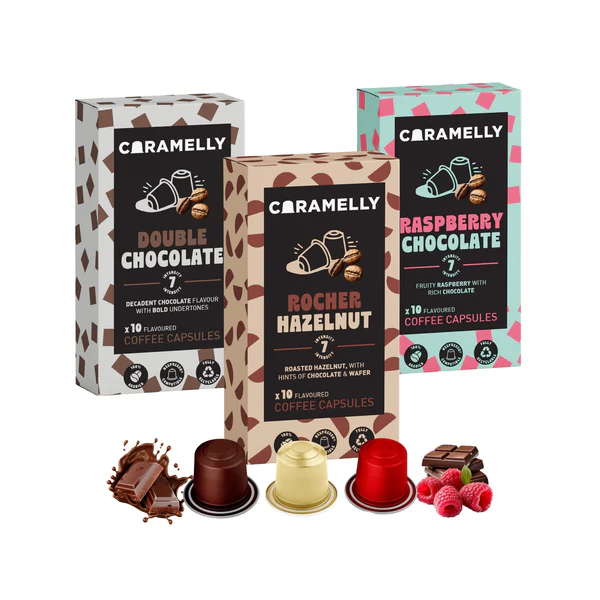 The Pack offers three luxurious medium-roast flavors: Rocher Hazelnut with creamy, nutty richness, Double Chocolate for bold cocoa indulgence, and Raspberry Chocolate blending tangy raspberry with smooth chocolate.