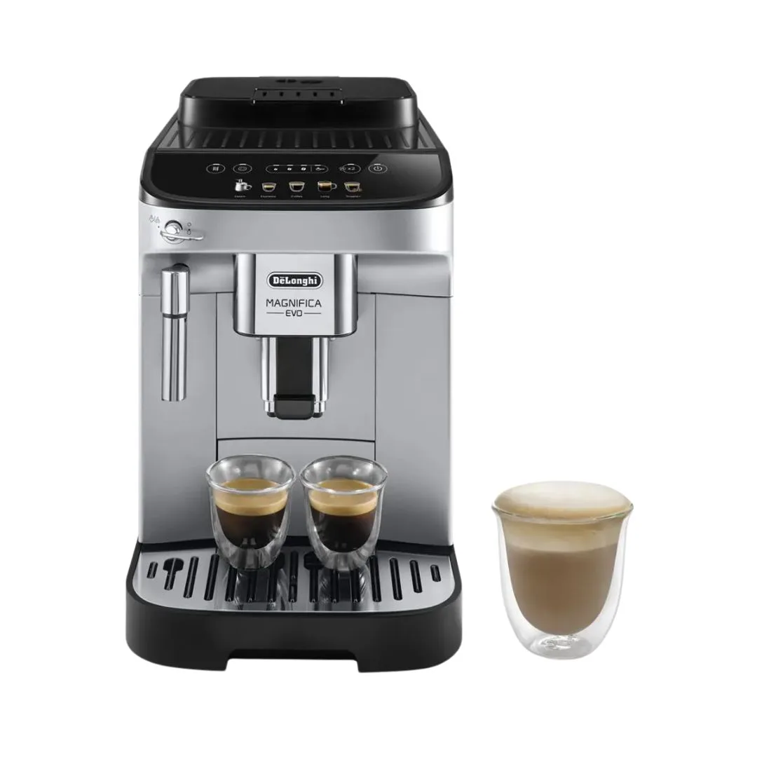 Enjoy the ultimate coffee experience from the comfort of your own home with the De’Longhi Magnifica Evo. Brew the perfect espresso from freshly ground beans, one of 5 recipes available with a single touch. Features an intuitive soft touch display with colour icons for each recipe. Its stylish silver and black finish is the perfect addition to any modern kitchen. Create personalised milk and coffee beverages from freshly ground beans 5 one-touch recipes including long and doppio+ Creamy milk foam thanks to the manual milk frother Dishwasher safe grid and removable brewing unit for an easy cleaning