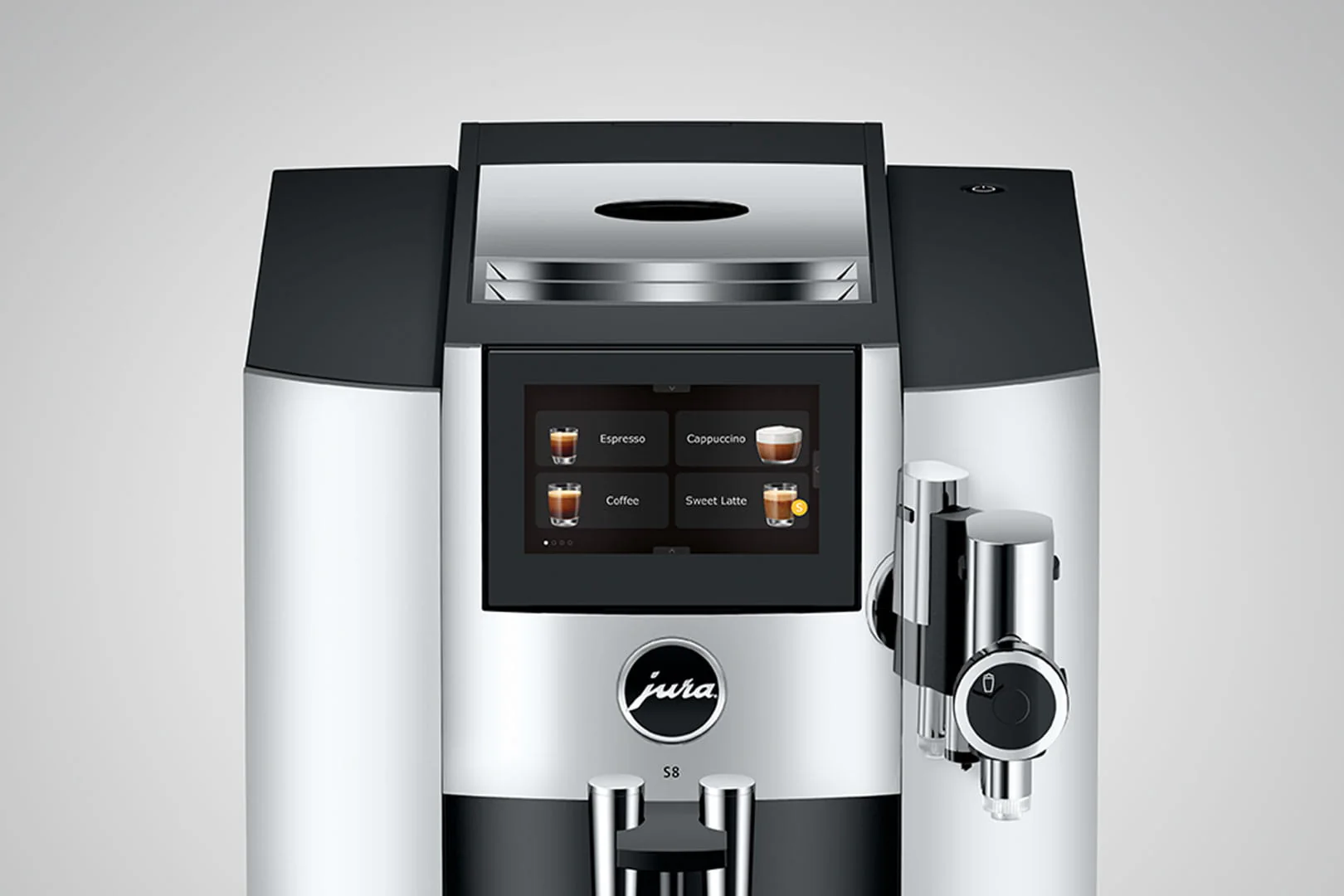 Jura S8 Chrome Fully Automatic Coffee Machine The Jura S8 Chrome is a state-of-the-art, fully automatic coffee machine designed to deliver barista-quality coffee at the touch of a button. It’s a testament to Jura’s commitment to innovation and precision. Key Features: Intuitive Color Display: Easily navigate through the menu
